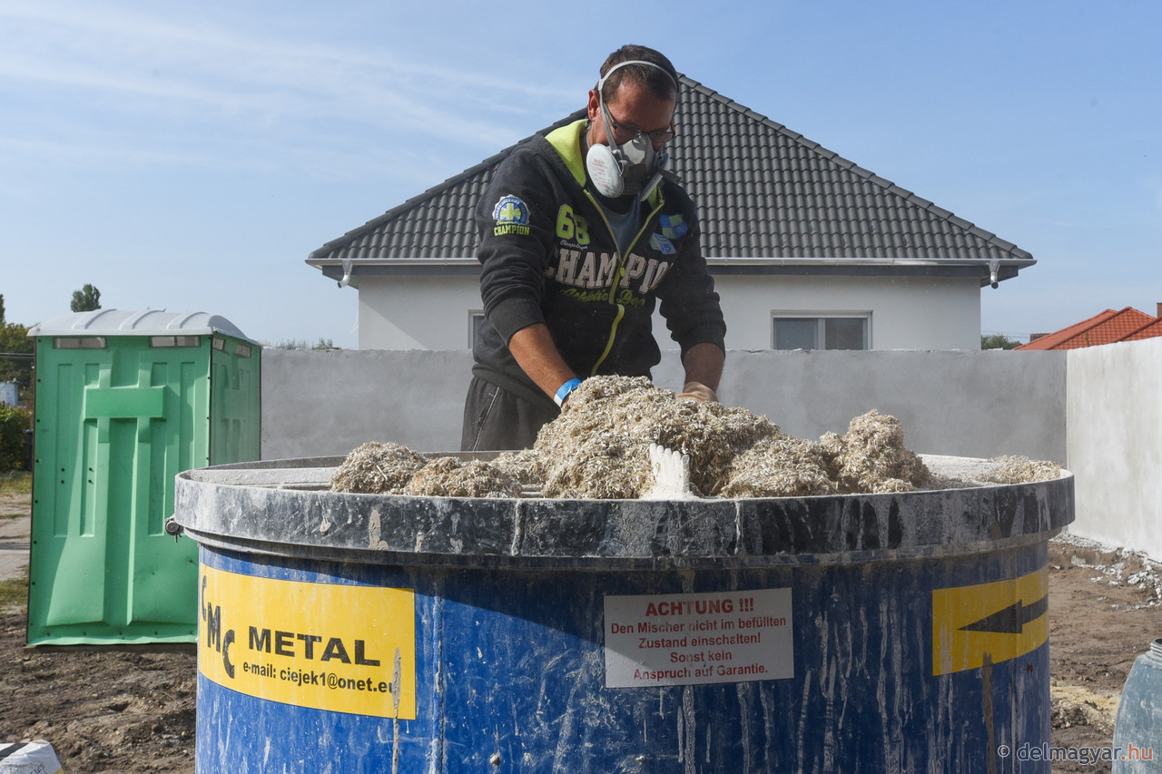 Bemutatóra hívta az érdeklődőket szombaton egy kenderbetonból épülő házhoz a szegedi KÖSZI Trade Szövetkezet. Horesnyik Béla, a kenderprojekt vezetője előbb elmagyarázta, majd megmutatta, egyszerűen és gyorsan halad a falazás. Öt ember öt tízórás munkanap alatt felhúzhatja egy családi ház falait, még ha közben zsaluz is. Ez Domaszéken már a második ház, ami ilyen környezetbarát technológiával készül. Az elsőt lakják, ez volt az országban is a legelső. A másodikat bemutatóépületnek szánják.